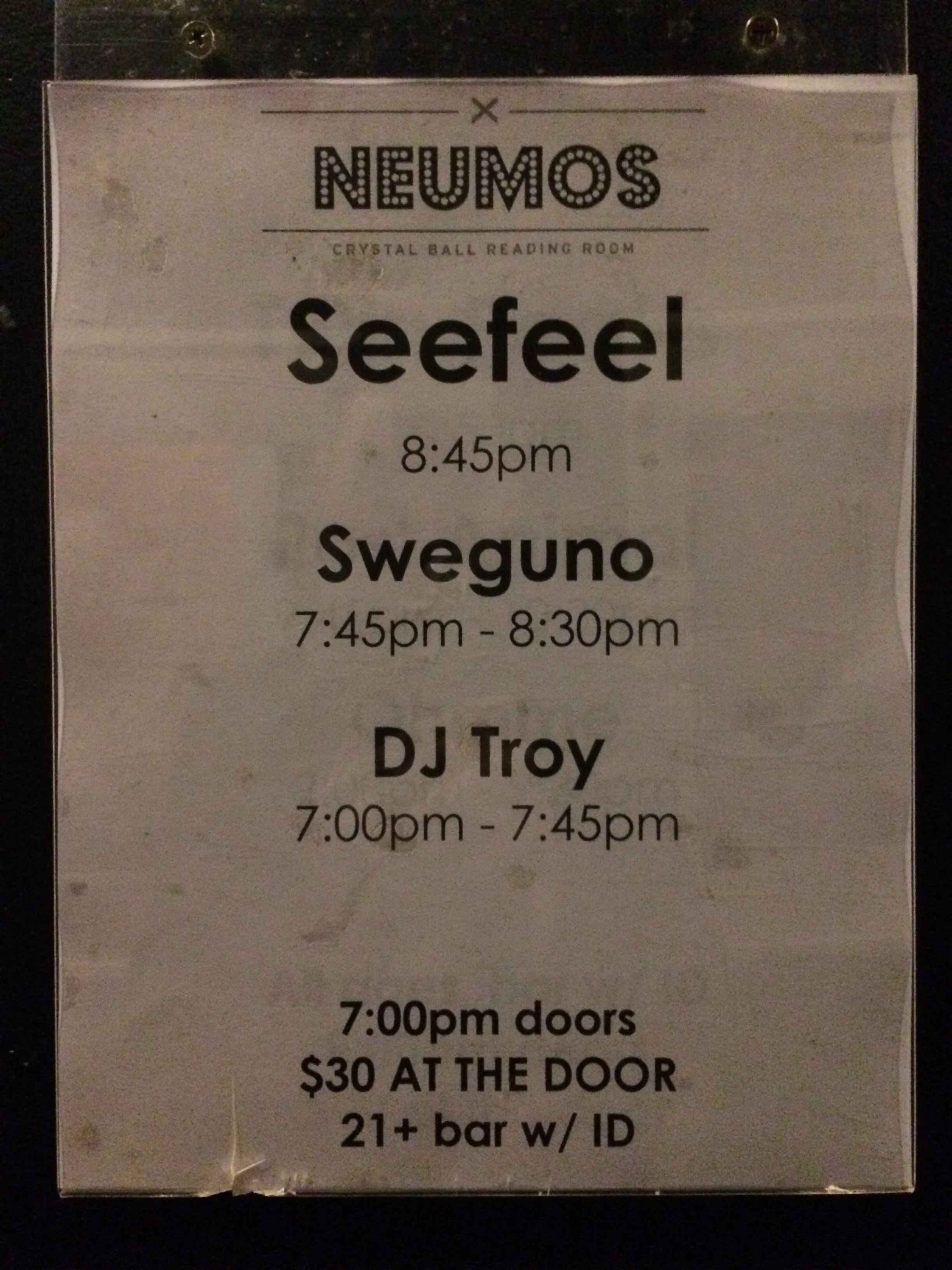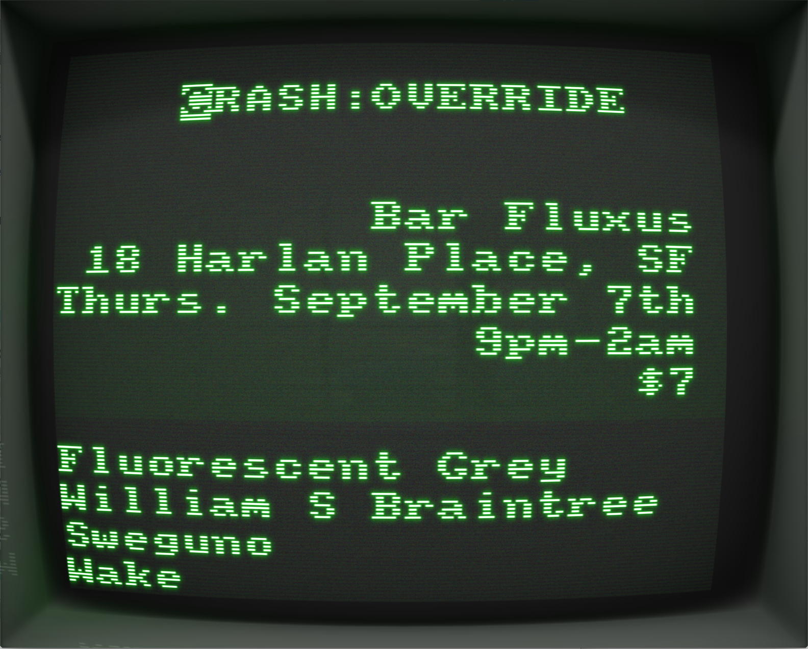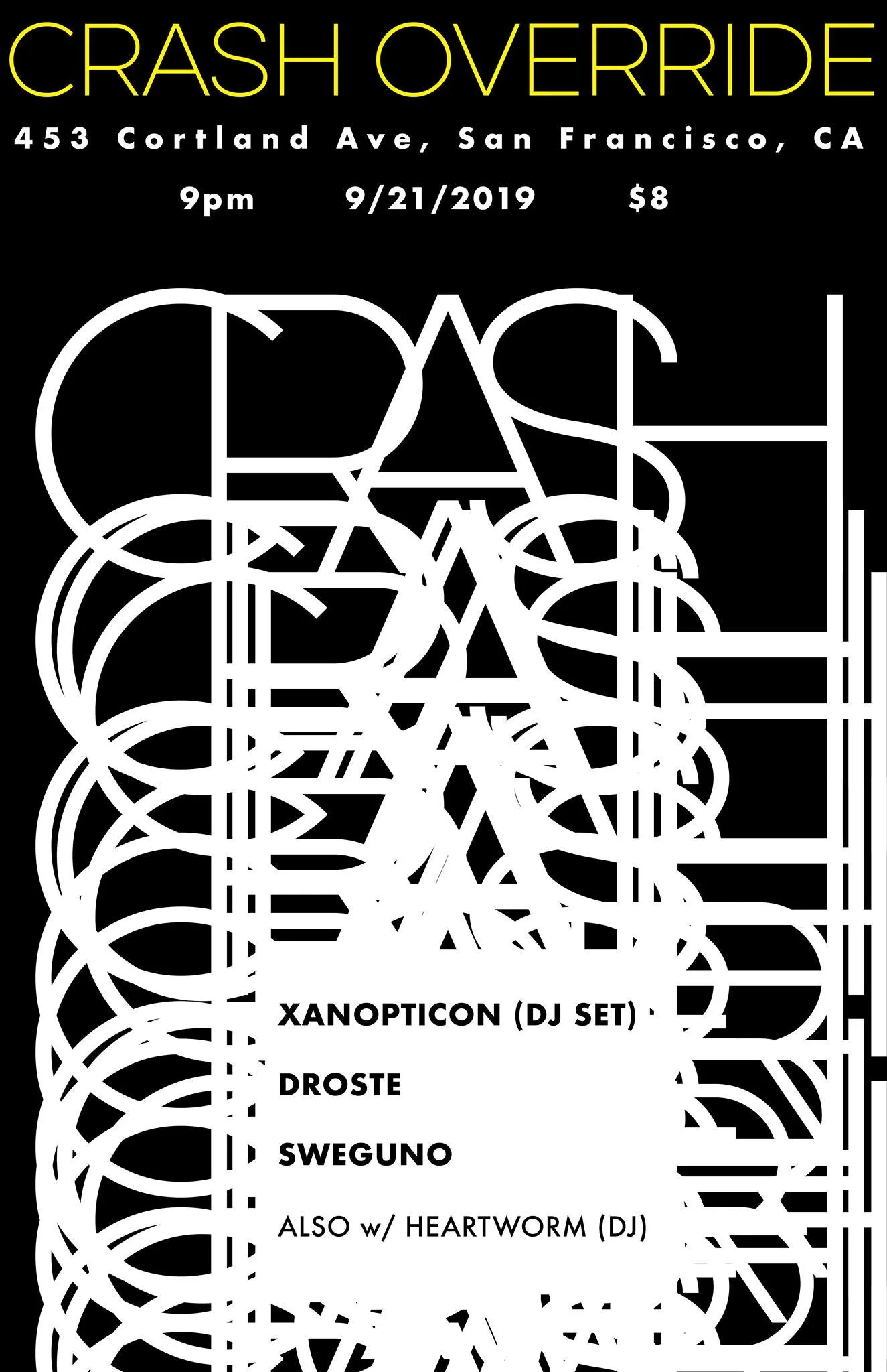 Live set of Sweguno material performed for ‘Crash:Override’ at Bar Fluxus in San Francisco. Sub on stage made it nearly impossible to hear the room at times in my set, so I was sometimes off-pitch. Bought IEMs shortly thereafter.